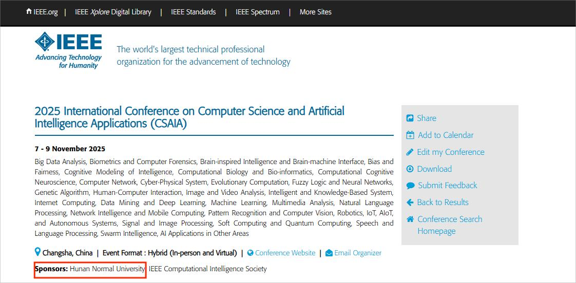 2025計算機科學與人工智能應用國際會議(2025 International Conference on Computer Science and Artificial Intelligence Applications,簡寫:CSAIA 2025)將于2025年11月7-9日在湖南長沙召開,會議由湖南師范大學和亞洲計算智能學會共同主辦、湖南師范大學信息科學與工程學院和湖南師范大學工程與設計學院進行承辦、IEEE Computational Intelligence Society (IEEE CIS)提供技術支持。會議將聚焦于計算機科學和人工智能應用領域的前沿發展,旨在促進全球范圍內的信息交流與科技創新,加強中外學術合作,共同推動計算機科學與人工智能技術的深入研究與廣泛實踐。目前會議已進入IEEE官方會議列表和CIS會議列表:https://conferences.ieee.org/conferences_events/conferences/conferencedetails/65930