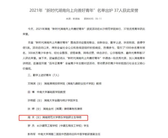校團委兼職副書記、公共管理學院李超民教授榮獲第十八屆“湖南省青年五四獎章”,這是共青團湖南省委、湖南省青年聯合會授予湖南青年的最高榮譽。我校音樂學院碩士生導師周末獲評2021年度“新時代湖南向上向善好青年”。
