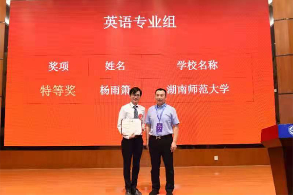 (供稿 外國語學院)近日,第十二屆“外教社杯”全國高校外語教學大賽(外語類專業組)湖南賽區比賽在中南大學舉行。我校外國語學院英語系教師楊雨簫獲得此次比賽的特等獎。