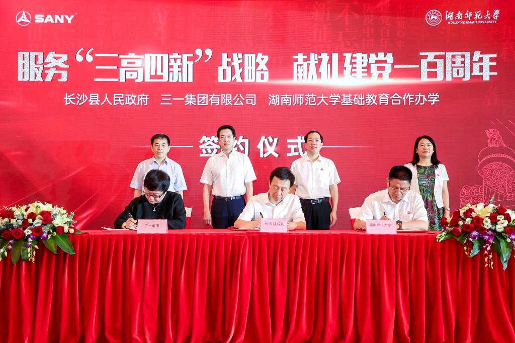 在向文波、劉起軍、張作林、姚春梅等嘉賓的見證下,鐘衛華與楊震簽署三一集團與湖南師范大學戰略合作框架協議和共建三一現代產業學院協議,彭正球、鐘衛華、唐賢清簽署了長沙縣人民政府、三一集團、湖南師范大學基礎教育合作辦學協議及捐贈協議。儀式后,與會人員參觀了三一集團車間,并就合作具體事宜開展了交流。