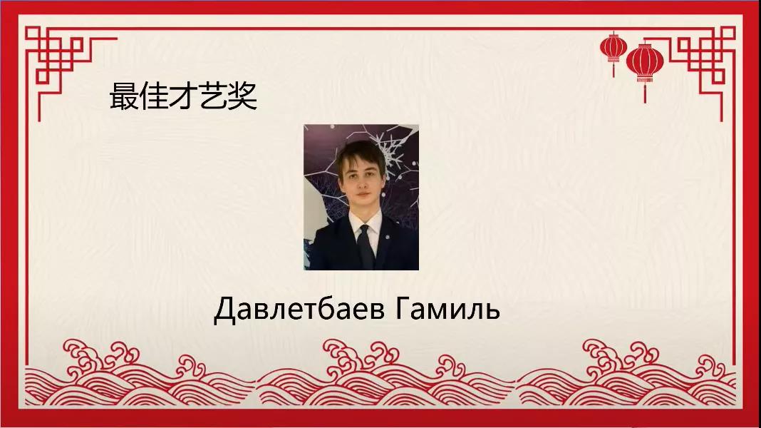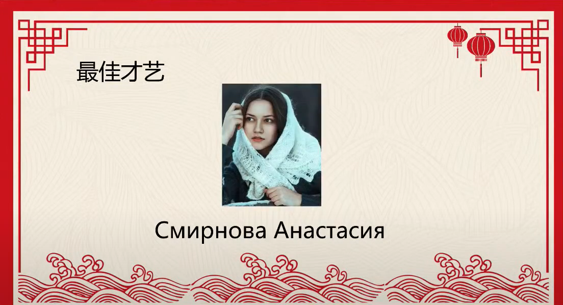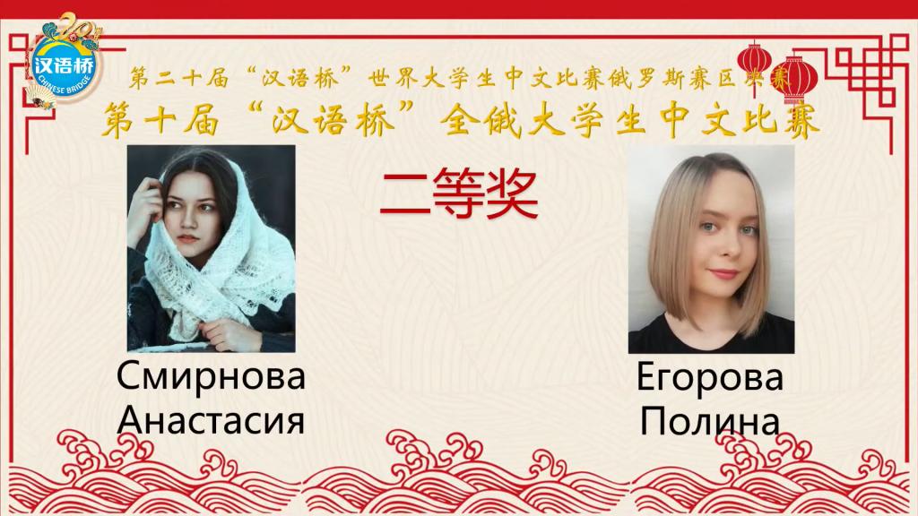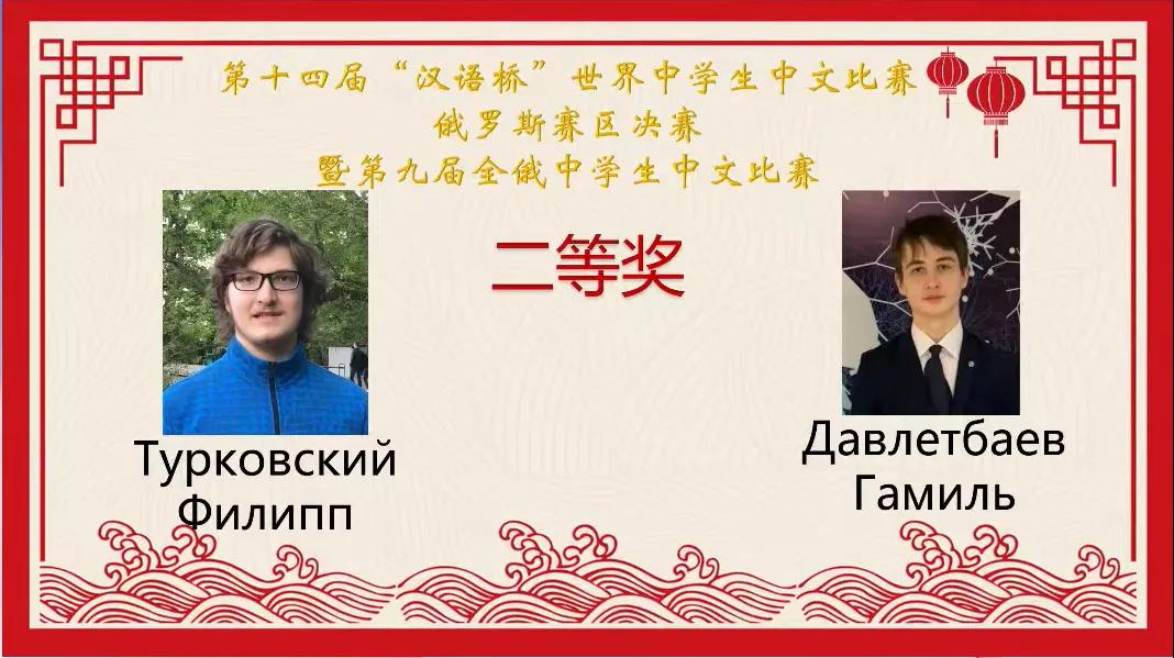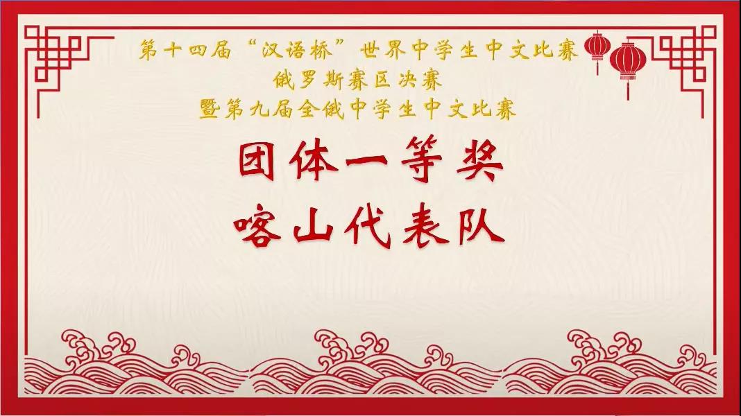 喀山聯邦大學孔子學院學員愛希(阿納斯塔西婭·斯米爾諾娃)、高明利代表喀山隊分別參加大學生、中學生比賽。愛希以出色的綜合實力榮獲二等獎,高明利榮獲二等獎和一學期進修生獎學金,助力喀山隊獲得兩個比賽的團體一等獎。
