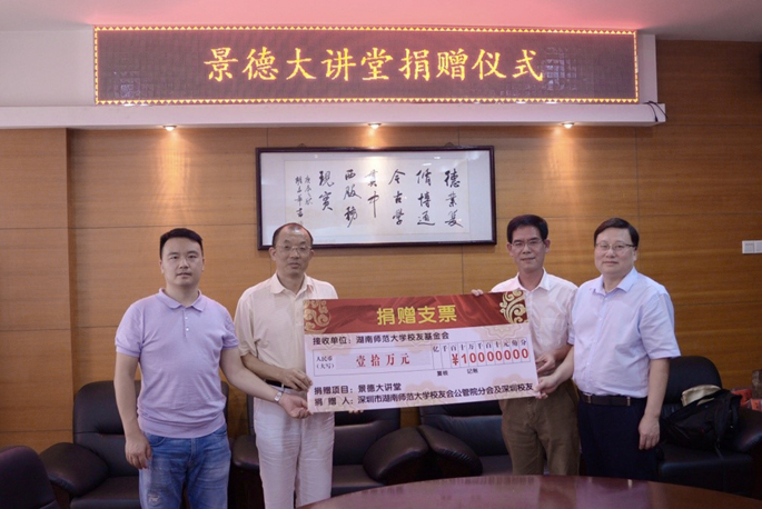 (供稿 校友總會)9月12日,我校深圳校友會執行會長兼秘書長鄒壽長、公共管理學院校友王軍代表深圳公共管理學院校友分會及部分深圳校友為母校捐資人民幣拾萬元,助力“景德大講堂”建設。副校長王輝出席捐贈儀式。