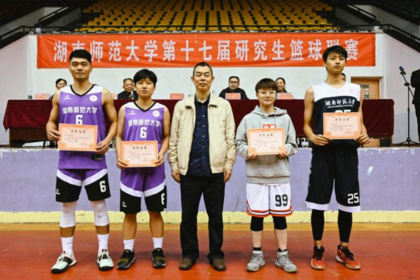 研究生院黨委書記彭運石和體育學院副院長郭獻中分別宣布了本屆籃球聯(lián)賽的獲獎名單和比賽結(jié)果。頒獎嘉賓為獲獎學院和個人頒發(fā)了錦旗和證書。