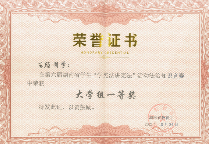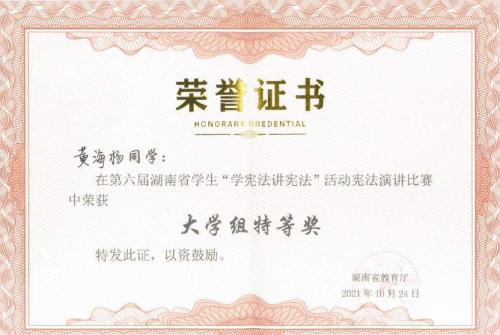 (記者 李翠霞)10月24日,由湖南省教育廳主辦、湖南省法學(xué)研究基地和湘潭大學(xué)法學(xué)院聯(lián)合承辦的第六屆全國學(xué)生“學(xué)憲法講憲法”活動湖南賽區(qū)總決賽在湘潭大學(xué)舉行。此次現(xiàn)場決賽分為高校組、高中組、初中組以及小學(xué)組進行,設(shè)演講、法治知識競賽兩類賽事。我校法學(xué)院學(xué)生黃海楊榮獲湖南賽區(qū)演講比賽大學(xué)組唯一特等獎,并將代表湖南省大學(xué)生參加由教育部舉辦的全國總決賽。法學(xué)院學(xué)生王超榮獲湖南賽區(qū)法治知識競賽大學(xué)組一等獎。