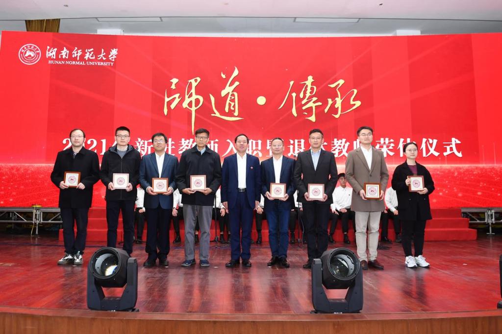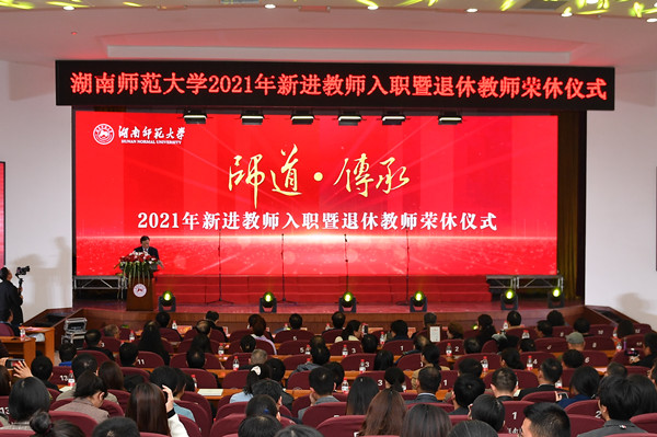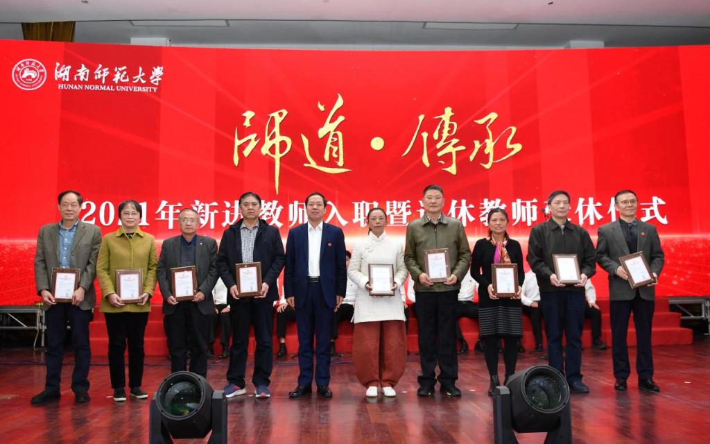 蔣洪新對(duì)榮休教師表示感謝與敬意,他說(shuō)榮休老師是學(xué)校事業(yè)發(fā)展的參與者、建設(shè)者。學(xué)校今天的每一份成就和榮光,都浸透著老師們的智慧和汗水。對(duì)新進(jìn)教師表示歡迎,他說(shuō),加盟湖南師范大學(xué),這是人生新的起點(diǎn),學(xué)校將是老師們堅(jiān)守學(xué)術(shù)理想、實(shí)現(xiàn)人生價(jià)值的精神家園。他強(qiáng)調(diào),這次又開(kāi)先河,隆重舉辦新進(jìn)教師入職暨退休教師榮休儀式,旨在進(jìn)一步弘揚(yáng)尊師重教、崇智尚學(xué)的風(fēng)尚,努力增強(qiáng)老師們的歸屬感、榮譽(yù)感和幸福感。他勉勵(lì)老師們,肩負(fù)立德樹(shù)人的使命,努力成為塑造學(xué)生品格、品行、品味的“大先生”。秉承仁愛(ài)精勤的校訓(xùn)精神,愛(ài)校如家、勇毅前行,共同守護(hù)好我們的精神家園。他指出,學(xué)校將不斷加強(qiáng)人才隊(duì)伍建設(shè),深化人事制度改革,秉承尊師重才傳統(tǒng),努力為全體教職工創(chuàng)造更加安心、舒心的教書(shū)育人條件。