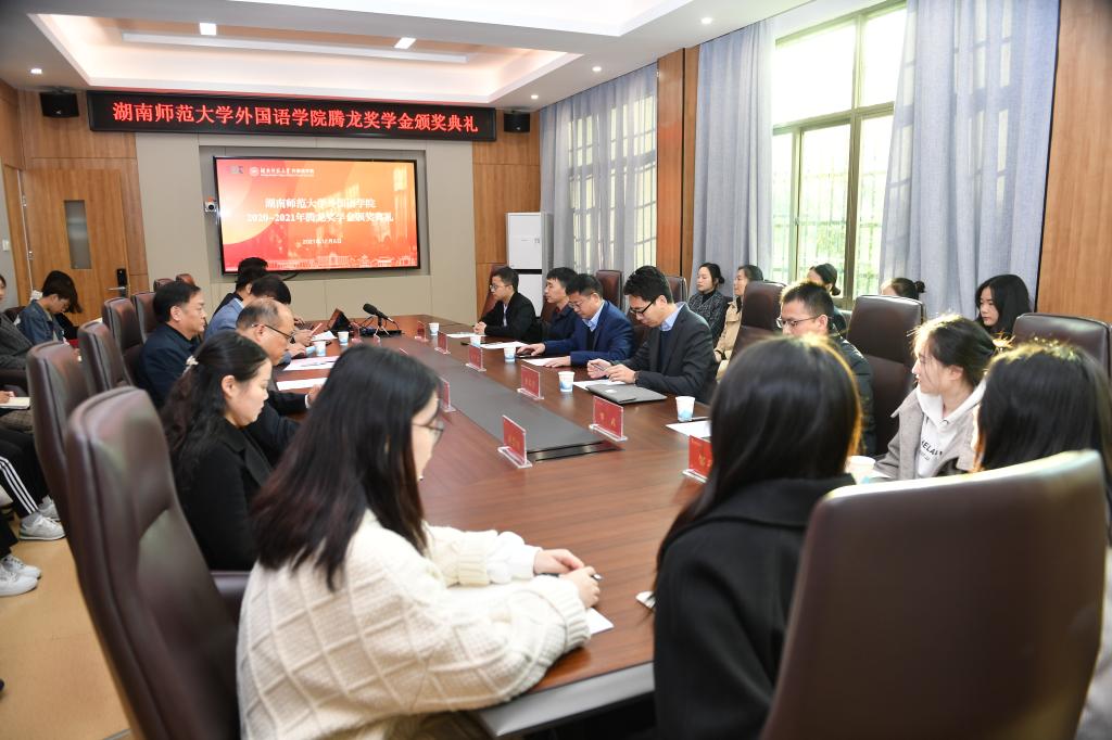 (記者 傅欣怡 余秋雁 通訊員 張元強)12月5日,我校外國語學院舉辦騰龍獎學金頒獎典禮。廣州騰龍健康實業股份有限公司董事長彭學文、總經理黃震宇,我校副校長王輝出席儀式。典禮由外國語學院學工辦主任張元強主持。