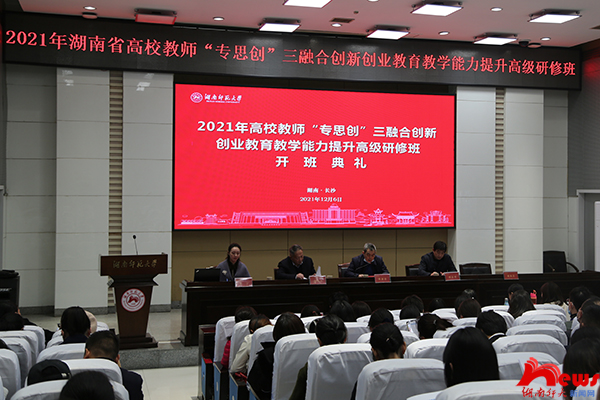 (記者 伍鴻彰 池淼)12月6日下午,由湖南省教育廳批準、湖南省高師培訓中心主辦、我校教務處(創新創業教育辦公室)承辦的2021年湖南省高校教師“專思創”三融合創新創業教育教學能力提升高級研修班開班儀式在至善講堂舉行。副校長蔣新苗出席會議,儀式由創新創業教育辦公室副主任安寧主持。
