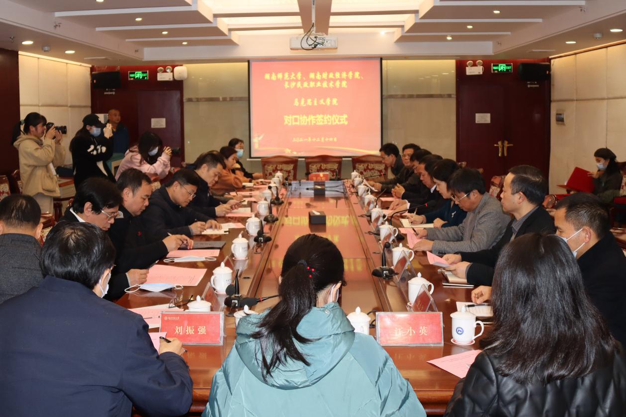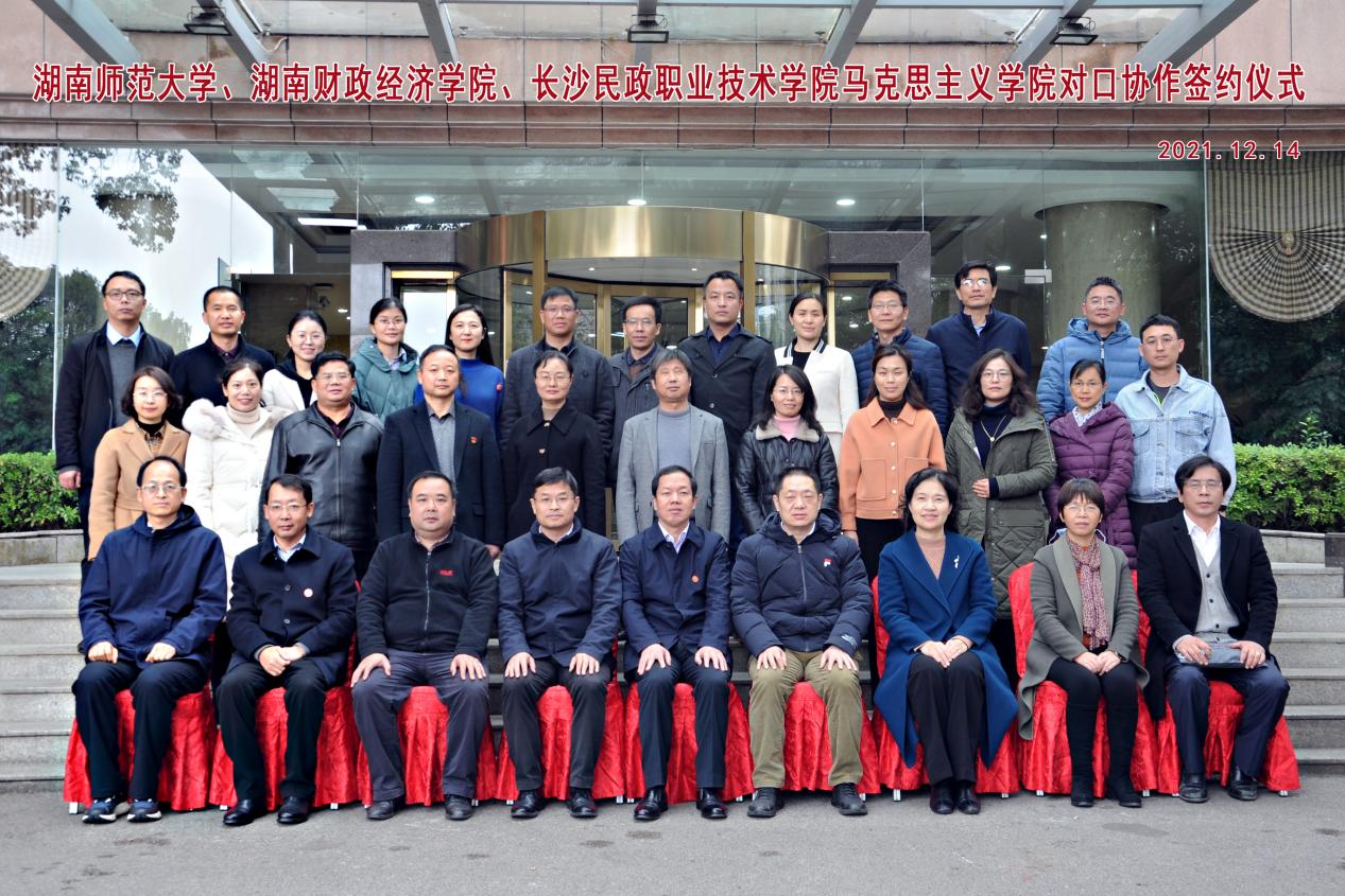 湖南財(cái)政經(jīng)濟(jì)學(xué)院、長(zhǎng)沙民政職業(yè)技術(shù)學(xué)院相關(guān)領(lǐng)導(dǎo)及教師代表,我校校黨委委員、宣傳部部長(zhǎng)段巍,馬克思主義學(xué)院教師代表等40余人參加簽約儀式。