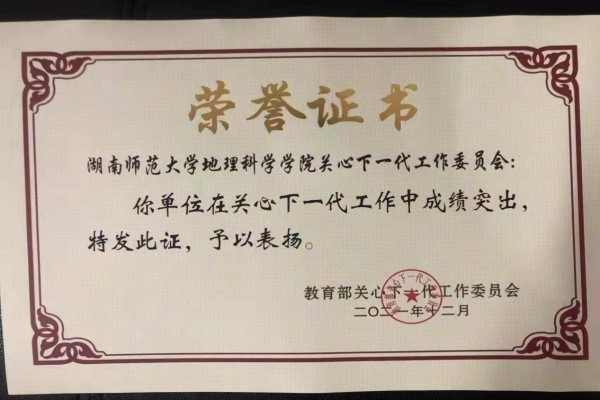 (通訊員 陳勝沖)近日,我校地理科學學院關心下一代工作委員被評為全國教育系統關心下一代工作“先進集體”,這是地理科學學院關工委工作連續三年獲評教育部關工委表彰。