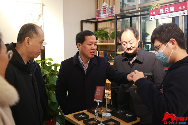劉起軍一行先后調(diào)研了師大文創(chuàng)館、湖南師大知識產(chǎn)權有限公司、創(chuàng)業(yè)孵化基地等地,聽取了相關單位負責人的工作匯報。劉起軍對桃子湖文化創(chuàng)意產(chǎn)業(yè)園的發(fā)展情況給予充分肯定,同時提出三點希望:一是希望創(chuàng)業(yè)園能更加重視培養(yǎng)師生的創(chuàng)新創(chuàng)造意識,提升師生的創(chuàng)新創(chuàng)造能力,為鍛煉師生創(chuàng)新創(chuàng)業(yè)本領提供平臺;二是希望打造校園文化品牌,擦亮師大文創(chuàng)等展示學校文化的窗口,為校園文化繁榮發(fā)展增色添彩;三是希望創(chuàng)業(yè)園能作為一個“練兵場”,不斷提升師生的知識產(chǎn)權意識,提升學校知識產(chǎn)權工作水平,推動學校科技成果轉化。