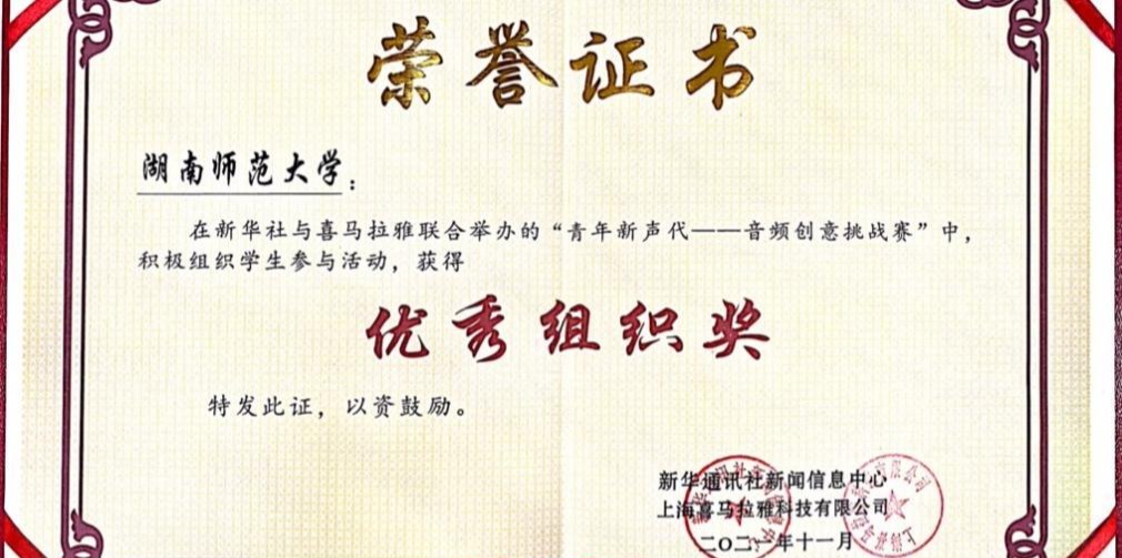 在新華社、喜馬拉雅聯合舉辦的“青年新聲代——音頻創意挑戰賽”中,我校積極組織發動學生參賽,參賽學生及作品數量居全省高校第一,榮獲優秀組織獎。