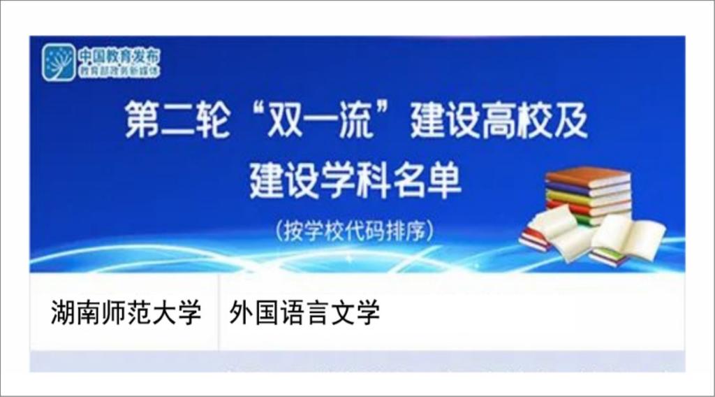 首輪建設期間,學科領銜國內外知名專家研制了《普通高等學校本科專業類教學質量國家標準(外國語言文學類)》等國家級標準,牽頭制定了《普通高等學校本科外國語言文學類專業教學指南(上)——英語類專業教學指南》等一系列文件,為外語教育改革提供了中國方案;學科帶頭人蔣洪新教授入選歐洲科學院院士,獲首屆全國教材建設先進個人,受到習近平總書記等黨和國家領導人的親切接見;獲教育部高校科研優秀成果獎(人文社科類)一等獎(系湖南省在該獎項上零的突破);英語、俄語、朝鮮語、法語等4個專業獲批國家一流專業建設點,“‘一帶一路’背景下跨文化障礙語言交際虛擬仿真實驗”“英語文學導論”“英語演講與辯論”等6門課程獲評國家級一流課程,1門課程入選教育部首批課程思政示范課程;學科教師團隊被確定為教育部首批“全國高校黃大年式教師團隊”(全國外語類團隊僅2個),外國語學院被人力資源和社會保障部、教育部授予“全國教育系統先進集體”榮譽稱號,英語系被中華全國婦女聯合會授予“全國三八紅旗集體”榮譽稱號。先后涌現出全國英語演講大賽總冠軍、全國大學生英語辯論賽一等獎、“挑戰杯”大學生課外學術科技作品競賽一等獎、全國師范生技能競賽一等獎等一大批優秀典型,斬獲各類獎項240余項。