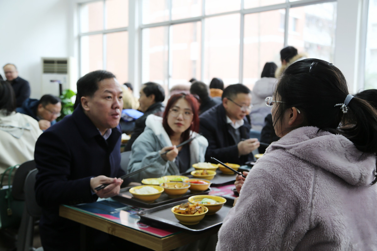 劉起軍一行考察了食堂餐飲基本情況,并聽取了相關(guān)負(fù)責(zé)人的工作匯報。正值午餐時間,劉起軍一行與學(xué)生共進午餐,詢問了學(xué)生的寒假生活、返校行程以及對食堂飲食的相關(guān)意見。他指出,相關(guān)部門要謹(jǐn)守安全規(guī)范、加強防疫意識、重視餐飲安全,同時要不斷提升餐飲質(zhì)量,保證學(xué)生營養(yǎng)攝入,為學(xué)生提供溫馨可靠的校園服務(wù)。