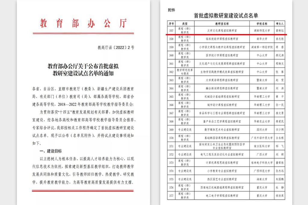 (供稿 外國(guó)語(yǔ)學(xué)院)2月22日,教育部發(fā)布通知公布首批教育部虛擬教研室建設(shè)試點(diǎn)名單,我校外國(guó)語(yǔ)學(xué)院曾艷鈺教授牽頭的文學(xué)文化課程虛擬教研室獲批入選。