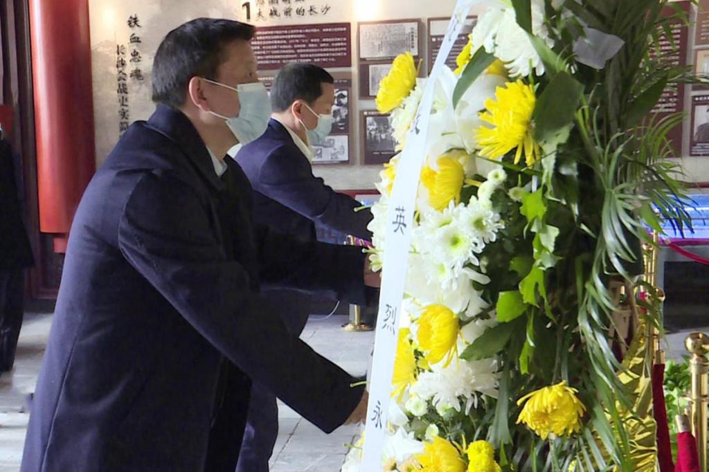 在麓山忠烈祠,蔣洪新、劉起軍代表全校師生向烈士敬獻花籃,整理緞帶,并率隨行人員向烈士行三鞠躬禮,表達對抗戰英烈的崇敬與哀思,緬懷為中國人民抗戰勝利奉獻終身的革命先烈和民族英雄。