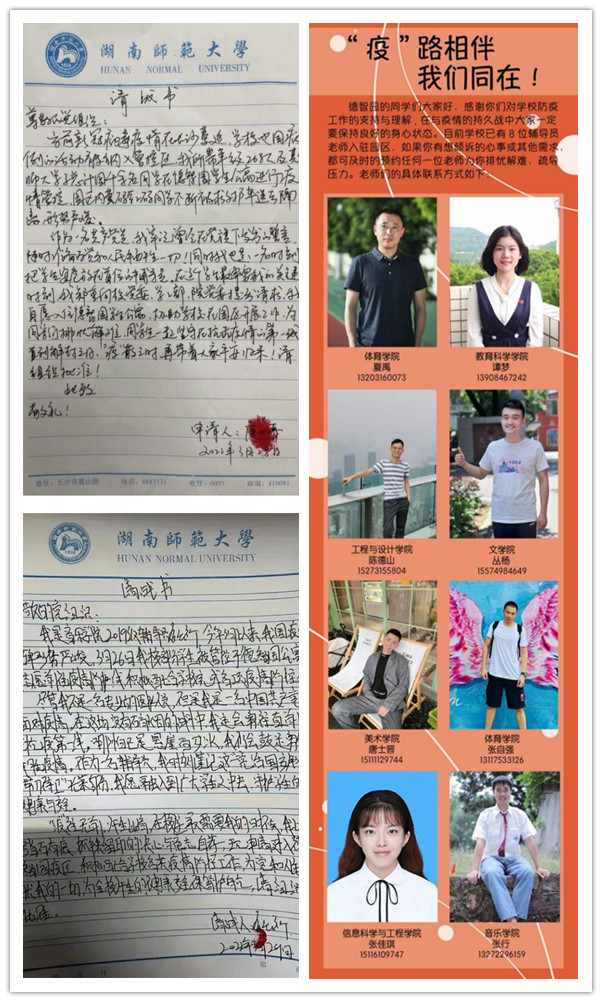 3月20日以來,新冠疫情在長沙多點爆發,根據長沙市和岳麓區防控辦相關要求,我校德智園學生公寓被納入管控區。園區內有常住學生3500余人,其中音體美三個學院學生占總人數的一半以上。因德智園區內無常駐學生工作管理人員,疫情防控壓力劇增,3月29日,體育學院夏禹、美術學院唐士晉、音樂學院張行老師主動向學校黨委遞交請戰書,申請入駐德智園區與學生同吃同住;4月1日,譚夢、陳德山、叢楊、張自強、張佳琪等老師入駐德智園區,全方位關心關愛學生身心健康,協助學校開展園區內疫情防控工作,成為了學校與學生的溝通樞紐,為學校分憂,為學生護航,直至德智園區解除管控。