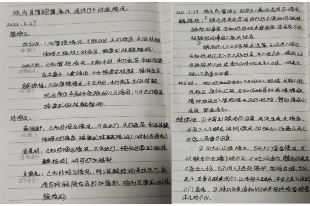 任紛的丈夫是一位社區(qū)工作者。疫情當(dāng)前,他的工作急、任務(wù)重,早出晚歸已是常態(tài),甚至凌晨電話就不斷響起。小孩也因疫情居家上網(wǎng)課,照顧家庭的責(zé)任便擔(dān)在她一個人的身上。這段時間,她每天都給在校內(nèi)的離休干部和退休廳干打電話聯(lián)系,了解他們的生活起居,記錄電話內(nèi)容的本子都詳細(xì)記錄,一字一字無不在體現(xiàn)著她對老同志們服務(wù)的用心。