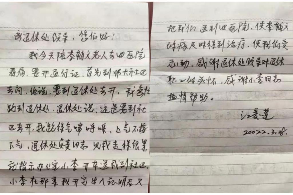 “我們深受感動,感謝退休處領(lǐng)導(dǎo)對退休職工的關(guān)懷,感謝小李同志的熱情幫助。”小李同志,是離退休工作處行政辦公室主任李成。這天,是管控的第三日,離退休工作處疫情應(yīng)急處置小組第三次召開了會議,王齊、尹建新、周青、方俊雄等人到會,討論劃入管控區(qū)后離退休老同志的防疫和生活就醫(yī)事項。江老師就在這天寫下了一封簡短而發(fā)自內(nèi)心的感謝信。