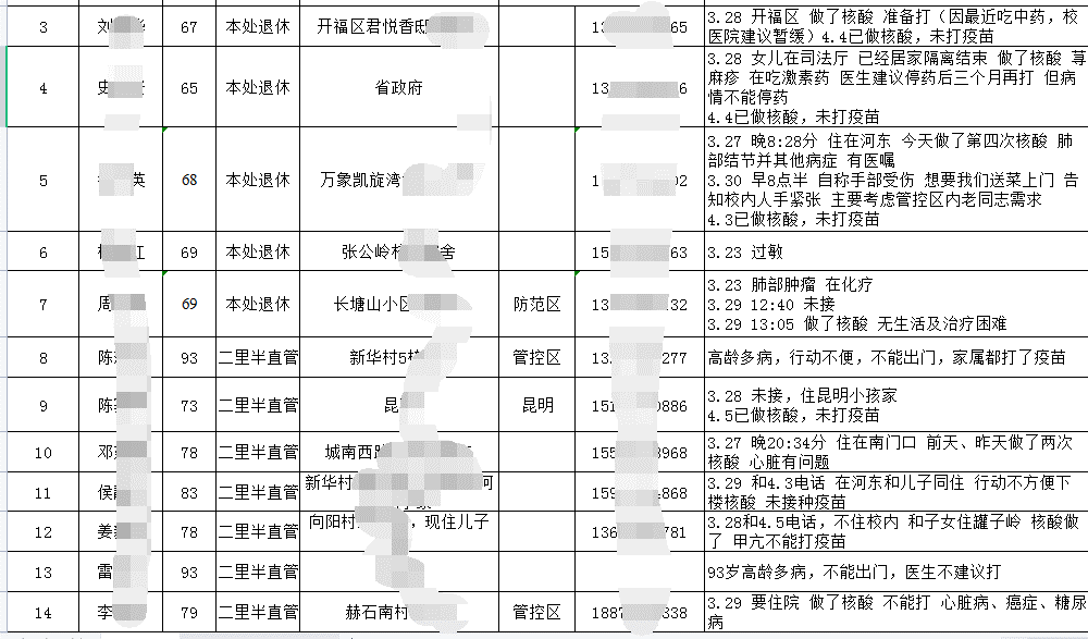 疫苗接種是疫情防控常態(tài)化下的長期工作。離退休工作處也一直將接種疫苗作為一項重要工作推進(jìn),建立起了完整完善的疫苗接種臺賬,掌握了接種情況和個人接種進(jìn)程。除負(fù)責(zé)本單位退休同志,離退休工作處還直管了89名老同志。他們的原所在單位經(jīng)合并調(diào)整后已不存在,故被學(xué)校統(tǒng)一安排到離退休工作處直接管理。這批老同志居住分散,互相之間聯(lián)系并不緊密,且多數(shù)年歲已高,平均年齡達(dá)到了79.6歲,80歲以上的占比過半,年齡最高的達(dá)到96歲。在未接種疫苗的人中,患病、行動不便因素占比超過75%。高齡、患病、喪失行動能力、意識不清……諸多因素成為了推進(jìn)工作的難點。