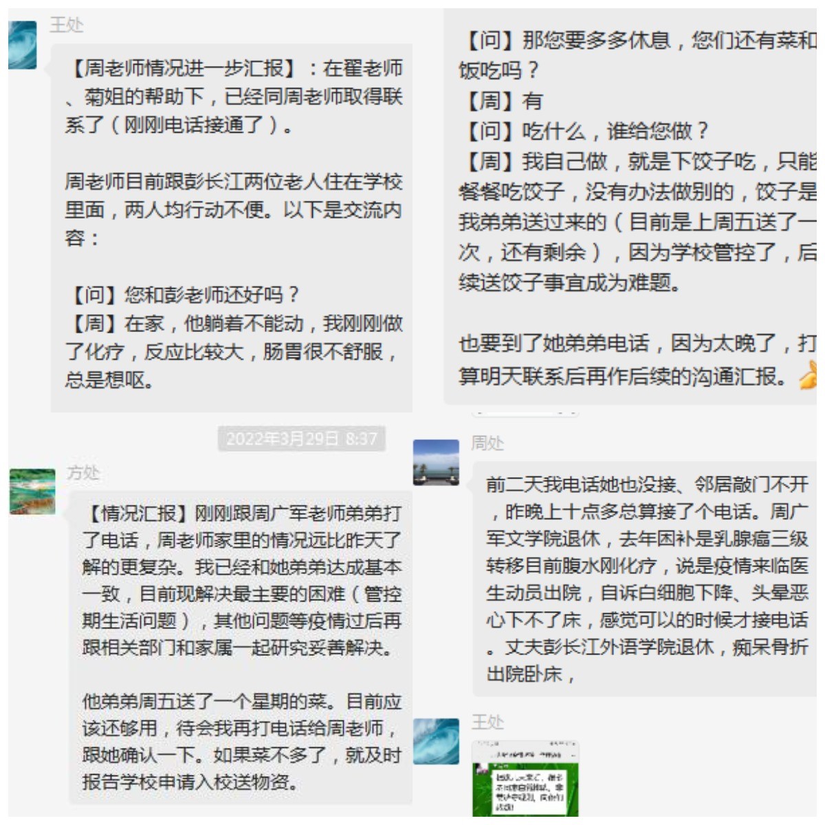 周老師身患癌癥正在化療期,管控前一日從醫(yī)院出院回家。她的丈夫彭教授則是患有阿爾茨海默癥,并因骨折臥病在床。兩人的孩子又被管控在上海,家中除了兩個患病老人再無旁人。收到消息后,離退休工作處與夫婦二人取得了聯(lián)系,兩人均行動不便,周老師因化療反應(yīng)較大,有腸胃不適、惡性嘔吐的癥狀,更令人感到擔(dān)憂的是生活物資儲備不足,只有剩余的一點冷凍餃子可供餐食。
