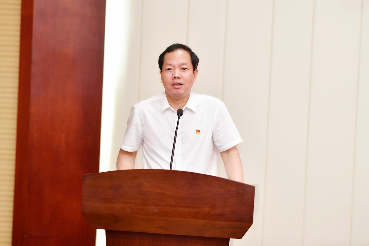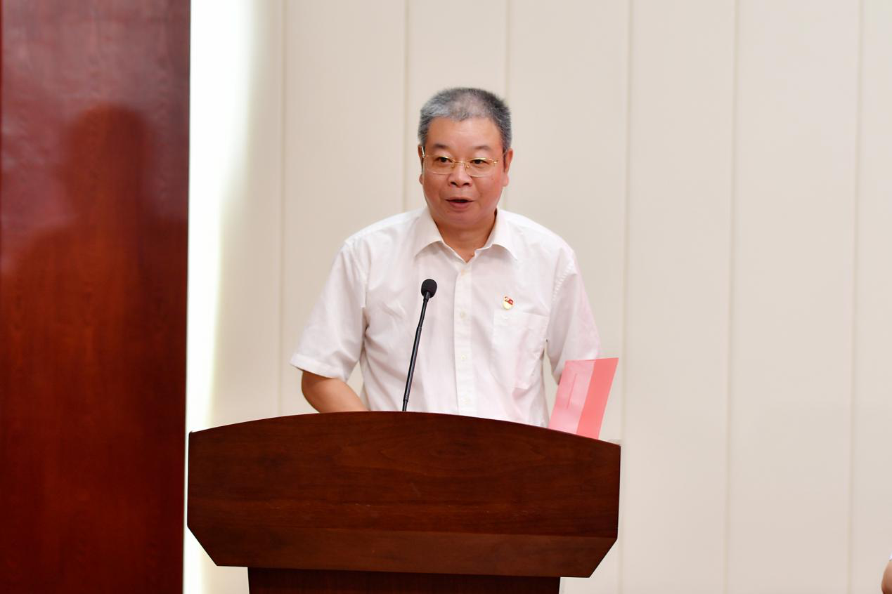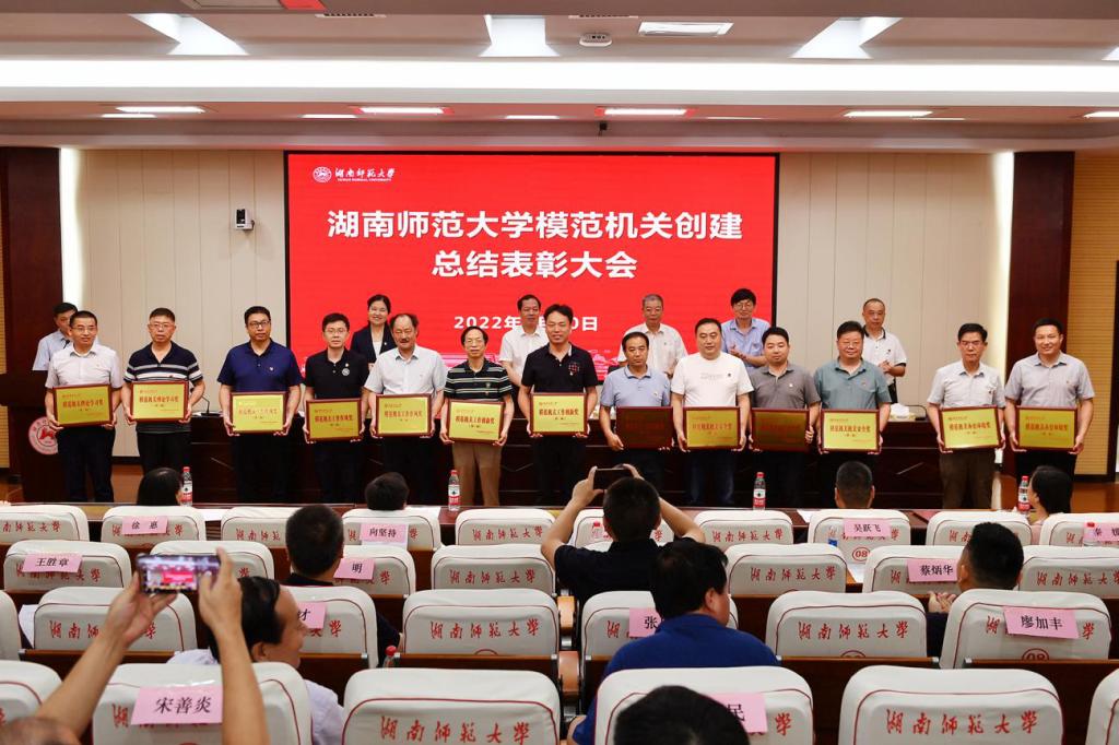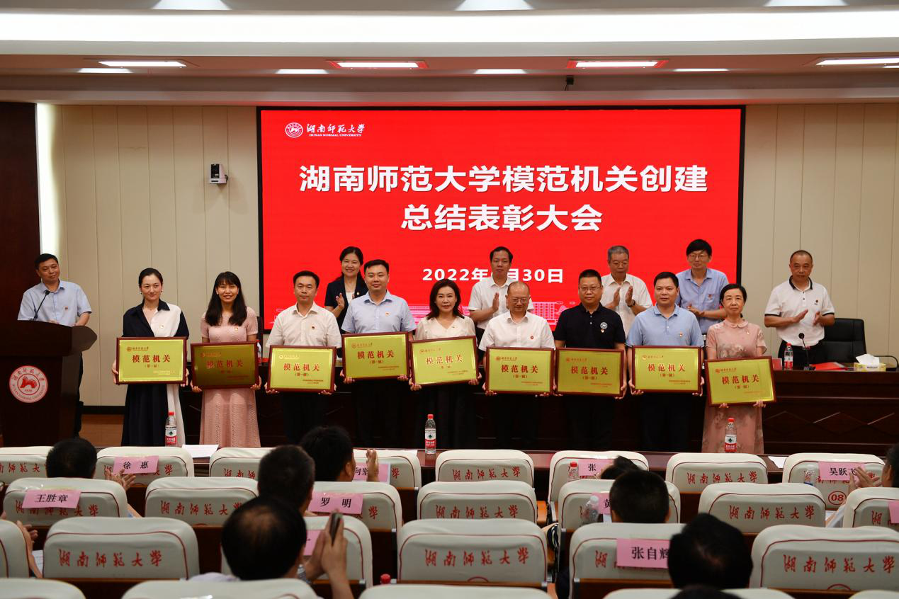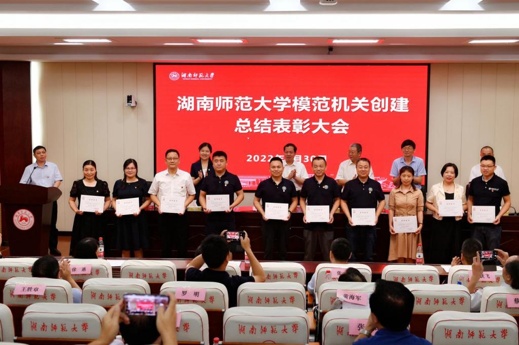 周俊武宣讀《關(guān)于湖南師范大學(xué)模范機關(guān)創(chuàng)建工作的表彰決定》,機關(guān)黨委副書記粟用湘宣讀《機關(guān)黨委關(guān)于表彰疫情防控志愿者的決定》。