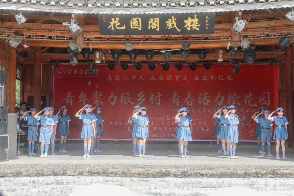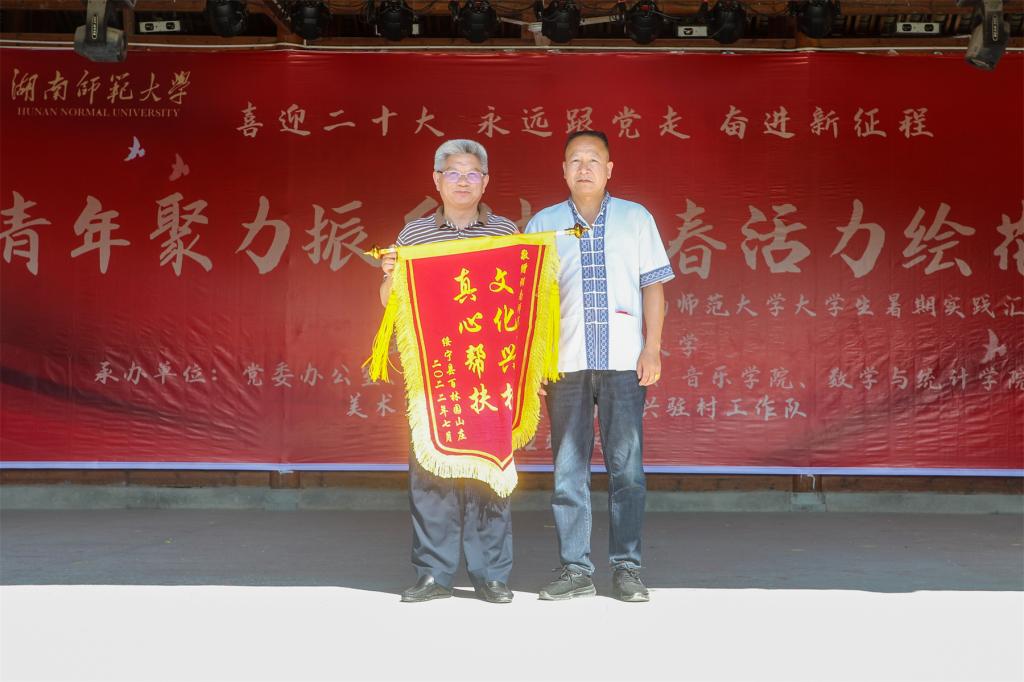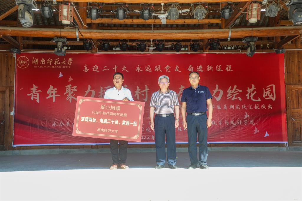 唐賢清一行還觀看了由我校各暑期實踐團(tuán)師生、花園閣村民和孩子們共同舉辦的以“青年聚力振鄉(xiāng)村,青春活力繪花園”為主題的文藝匯報演出,并對參與社會實踐和大學(xué)生暑期實踐匯報演出的師生進(jìn)行了慰問。唐賢清代表學(xué)校向綏寧縣花園閣村捐贈物資,并接受花園閣村敬獻(xiàn)的錦旗。