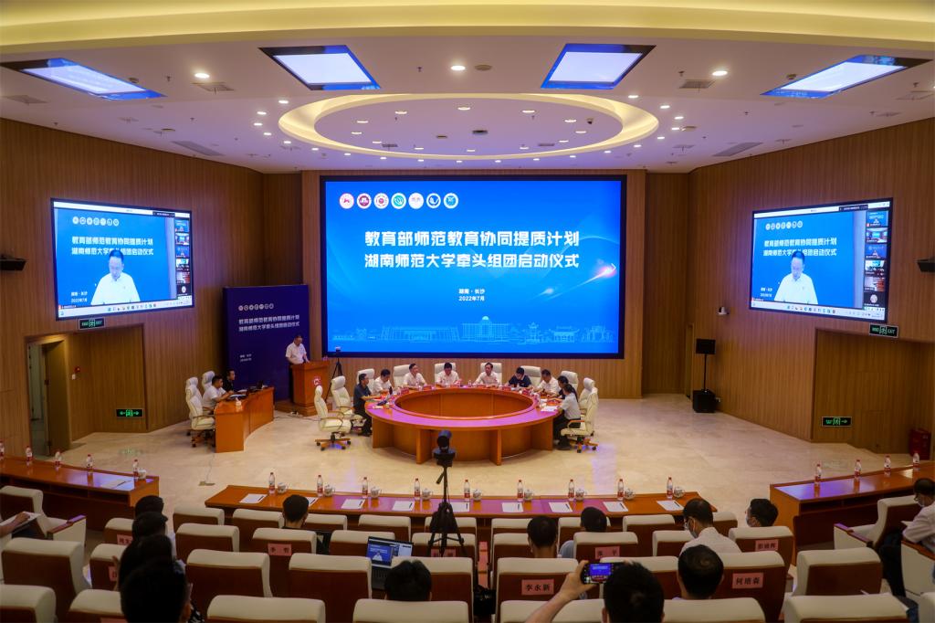 (通訊員 劉飛 記者 馮振輝 劉姣)7月26日,教育部師范教育協同提質計劃湖南師范大學牽頭組團項目啟動會,以線上線下結合的形式召開。教育部教師工作司副司長宋磊,湖南省教育廳副廳長王玉清,福建省教育廳副廳長吳偉平應邀出席會議。湖南師范大學校長劉起軍,福建師范大學校長王長平,閩南師范大學校長李順興,長沙師范學院副校長皮軍功,湖南第一師范學院黨委書記羅成翼,懷化學院校長董正宇,寧夏師范學院黨委書記張治榮等分別代表牽頭高校、參與幫扶高校和重點支持院校發言。會議由湖南師范大學副校長劉子蘭主持。