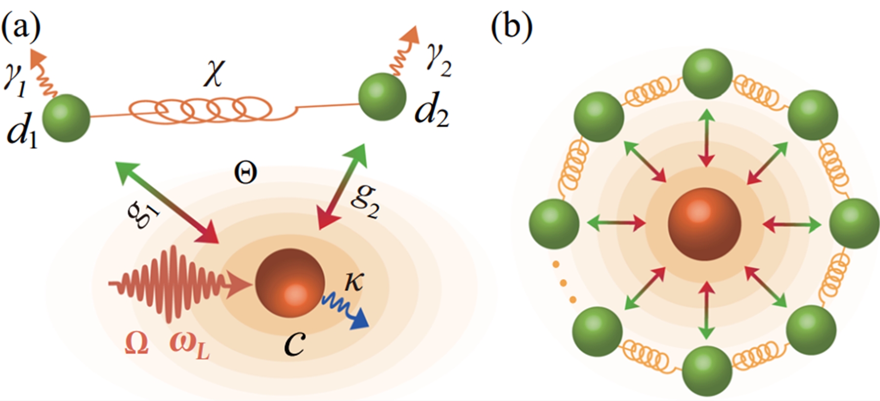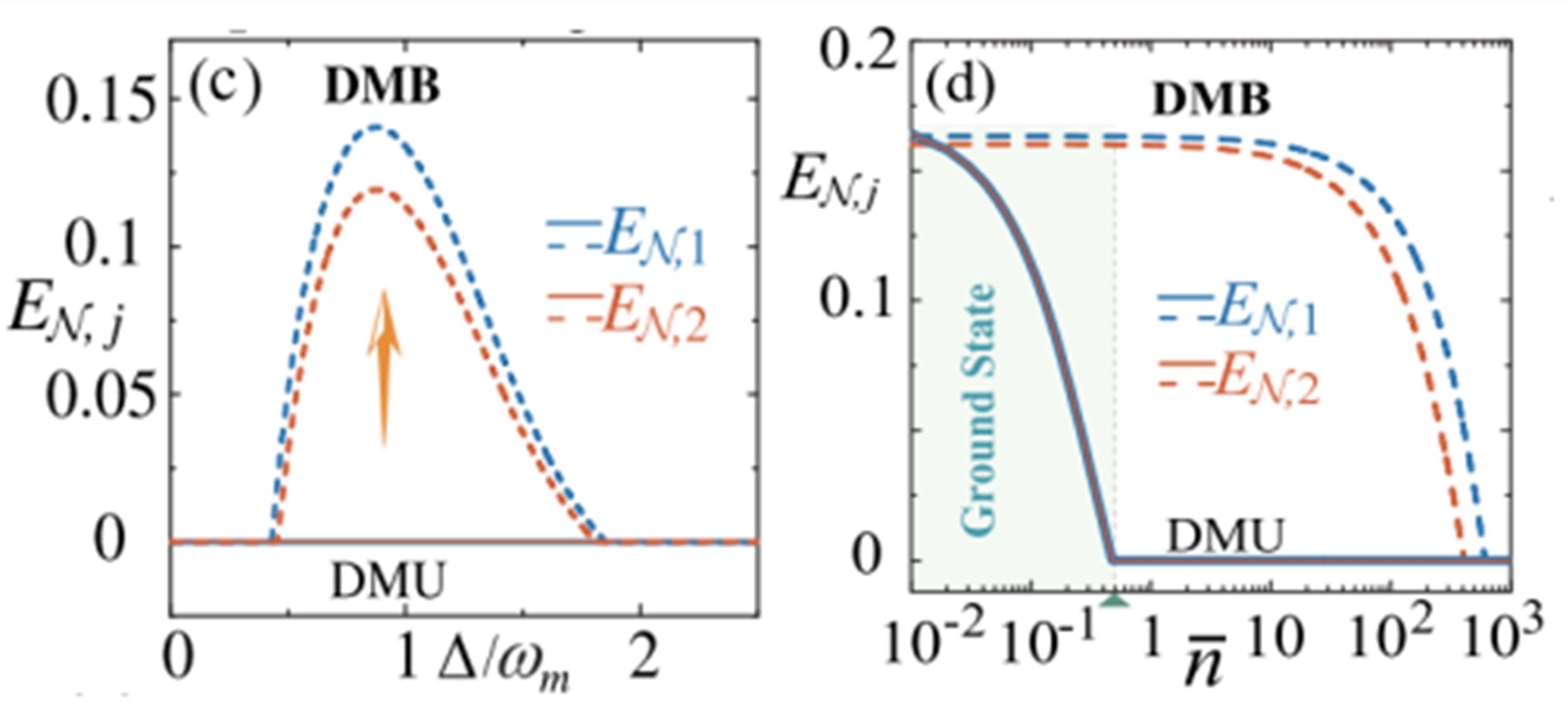 圖:(a)單個光學模式耦合兩個力學模式的物理模型示意圖。(b)單個光學模式耦合多個力學模式的物理模型示意圖。(c,d)當存在暗模(DMU)和打破暗模(DMB)時,光力糾纏度量隨著(c)腔場失諧和(d)熱聲子數的變化。