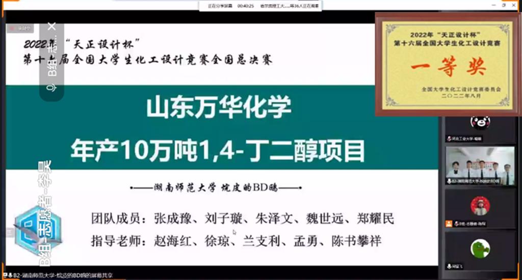 (供稿 化學化工學院)8月21日至22日,由中國化工學會、中國化工教育協會主辦,華東理工大學承辦的2022年“天正設計杯”第十六屆全國大學生化工設計競賽全國總決賽以線上形式舉行。化學化工學院2019級本科生參賽隊斬獲全國一等獎。