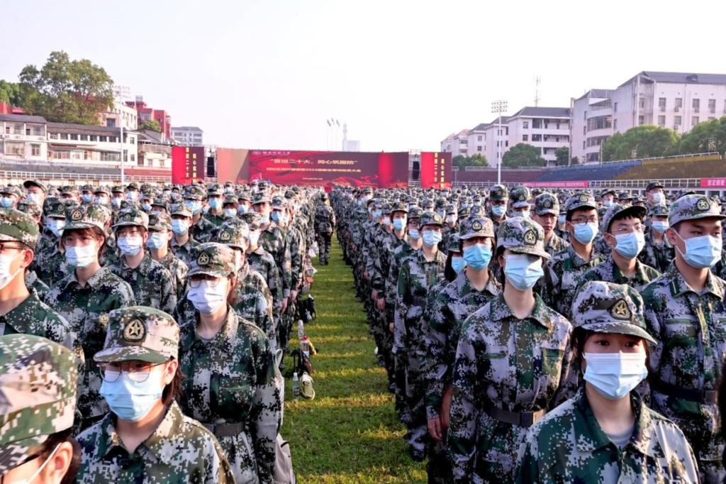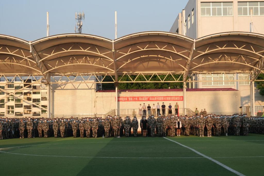 2022級新生軍訓動員大會在莊嚴的國歌聲中拉開帷幕。四個校區的女子國旗護衛隊隊員們同時護送國旗走向升旗臺,全場師生一同高唱國歌,共同注目五星紅旗冉冉升起。