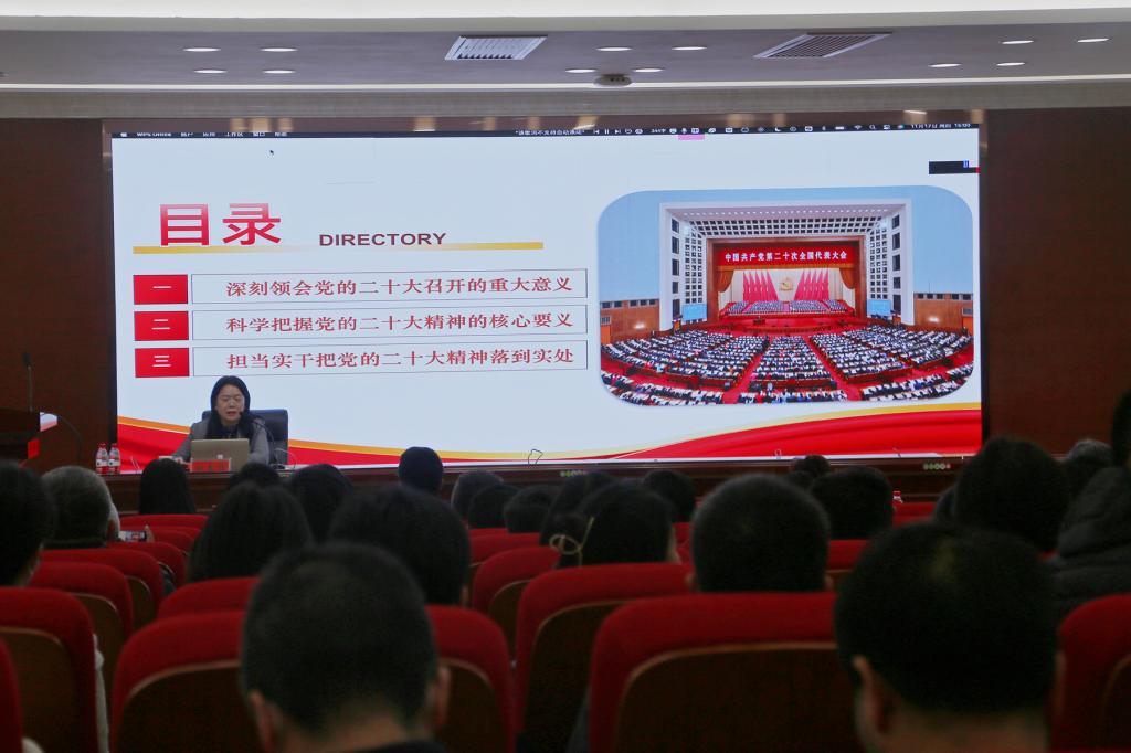 姚春梅從深刻領會黨的二十大召開的重要意義、科學把握黨的二十大精神的核心要義和擔當實干把黨的二十大精神落到實處三個方面進行宣講。她從大會成果、中華民族發展和世界文明發展三個角度介紹了黨的二十大召開的重要意義,帶領師生深刻領會和把握黨的二十大精神,解讀了過去5年工作和新時代10年偉大變革的重大意義、習近平新時代中國特色社會主義思想的世界觀和方法論以及中國式現代化推進中華民族偉大復興的使命任務等內容。她指出,深入學習宣傳貫徹黨的二十大精神是學校當前和今后一個時期的首要政治任務,我們要牢牢把握正確政治方向,深刻領會黨的二十大報告關于教育的新思想、新要求,堅持為黨育人、為國育才,辦好人民滿意的教育,為推動教育強國建設和中華民族偉大復興的使命任務貢獻力量。
