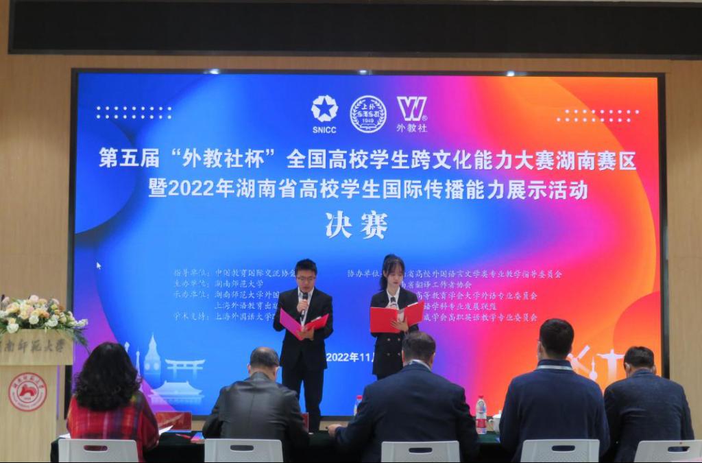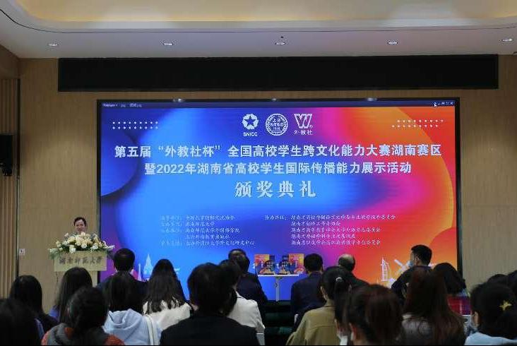 (通訊員 李澧)11月26日,第五屆“外教社杯”全國高校學生跨文化能力大賽湖南賽區(qū)暨2022年湖南省高校學生國際傳播能力展示活動決賽以及頒獎典禮在我校外國語學院騰龍樓613舉行。本次大賽采用線上線下結合的方式舉辦。上海外語教育出版社副總編輯謝宇、我校副校長劉子蘭出席頒獎典禮并致辭。頒獎典禮由外國語學院副院長劉白教授主持。