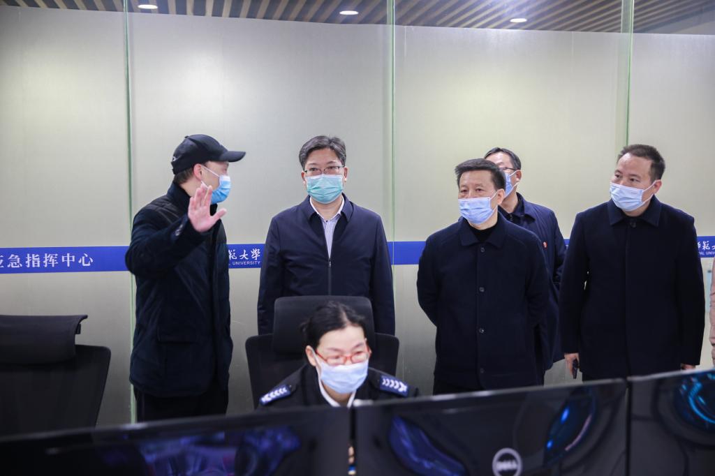 曾市南一行實地走訪了“雙一流”建設展廳、世承書院、木蘭路食堂、校醫院、應急指揮中心等重點區域和環節,詳細了解疫情防控期間在校師生的學習生活情況,向疫情期間堅守在崗位的工作人員致以關心問候。
