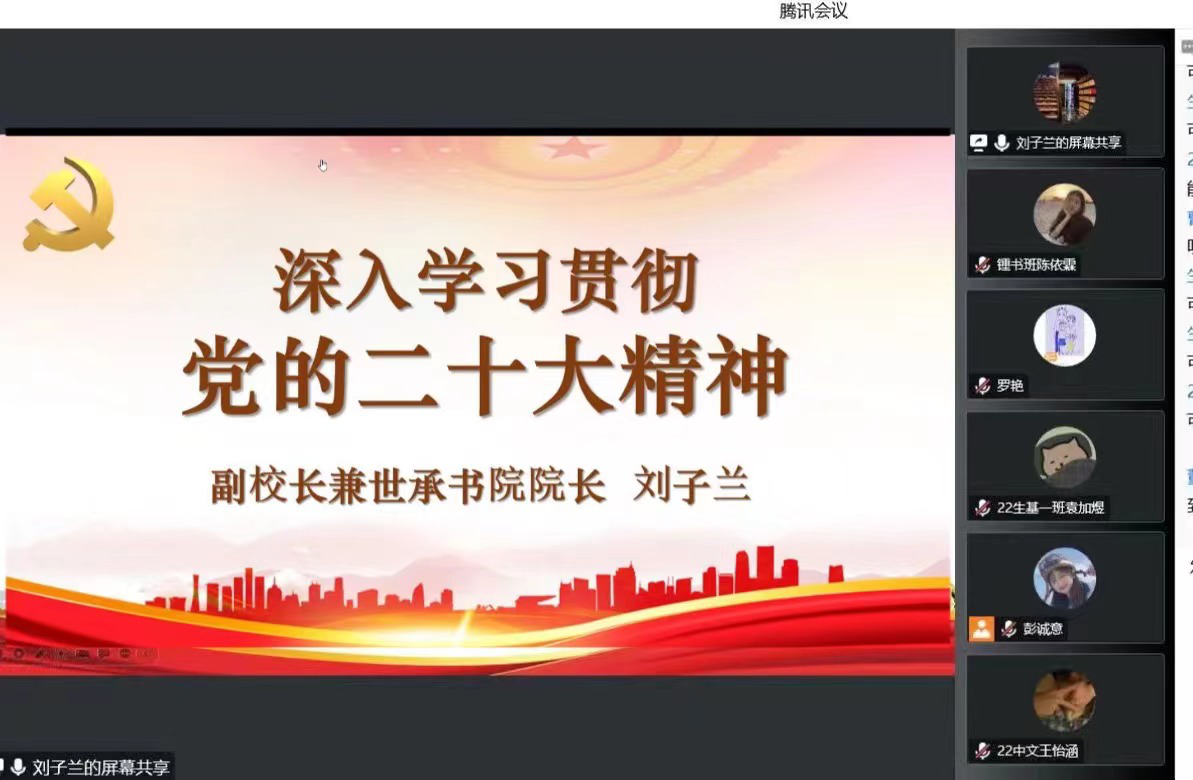 (通訊員 潘看)12月1日下午,世承書院在線上舉行了主題為“深入學習貫徹黨的二十大精神”的宣講會。此次宣講會由副校長兼世承書院院長劉子蘭教授主講。世承書院副院長兼直屬黨支部副書記羅艷主持會議。