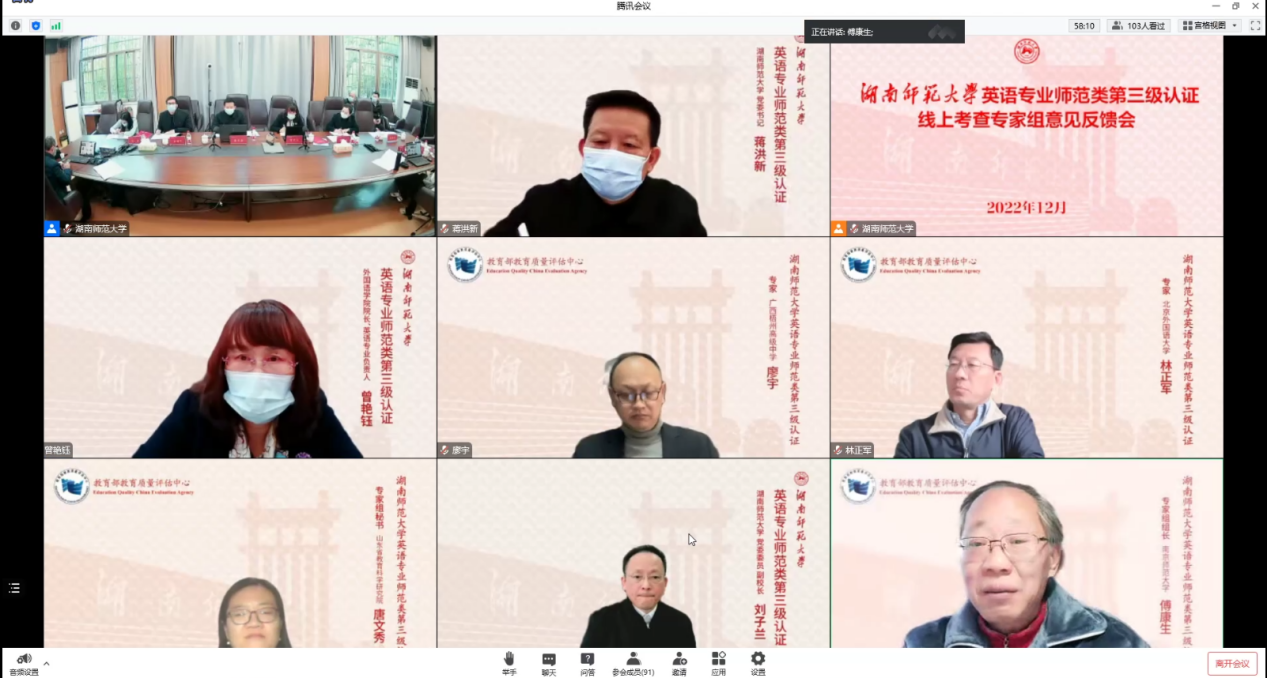 12月2日,專家組現場考查意見反饋會在線上舉行。傅康生代表專家組反饋考查總體意見。專家組一致認為,湖南師范大學的英語專業目標定位準確、課程結構規范,以英語專業學科建設為基礎,在取得豐碩研究成果的同時,為英語師范專業的人才培養奠定了扎實雄厚的學科基礎,培養了大批高質量高水平的卓越教師,在培養過程中凸顯了卓越教師創新型教師培養、學科交叉等重要內容和特點,在教學資源、師資隊伍、教學質量監控等方面取得了諸多成果。專家組也就進一步完善教育實踐管理和教育實踐評價、畢業要求達成情況與課程目標達成情況評價、三級進階指標探索等方面提出了改進意見與建議。