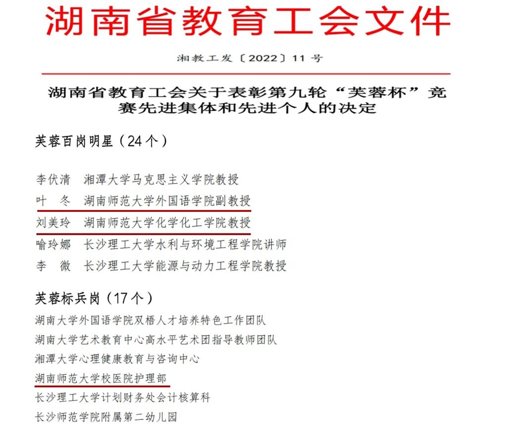 (供稿 校工會)近日,湖南省第九輪女職工“芙蓉杯”競賽圓滿收官,我校工會在此輪競賽中榮獲多項殊榮,獲獎數位居全省高校前列。其中,醫學院臨床醫學系獲評湖南省總工會“湖南省芙蓉標兵崗”(全省教育系統僅4家);校醫院護理部獲評湖南省教育工會“芙蓉標兵崗”,化學化工學院劉美玲教授、外國語學院葉冬副教授獲評湖南省教育工會“芙蓉百崗明星”。
