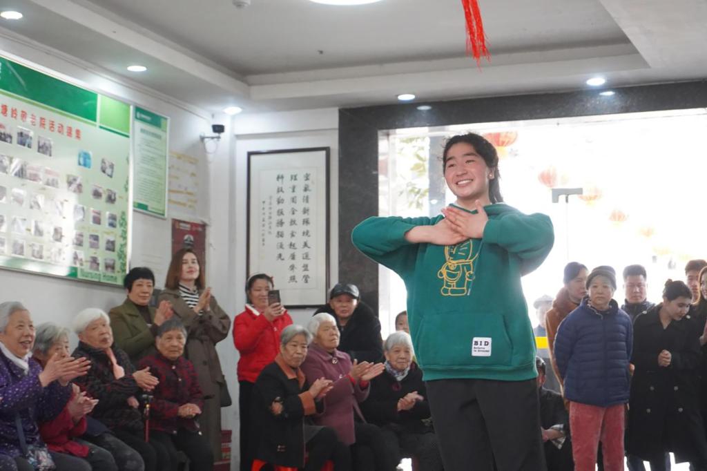 學(xué)以致用,實踐躬行。參觀學(xué)習(xí)結(jié)束后,各民族同學(xué)們帶著愛心禮包前往望城區(qū)高塘嶺敬老院為老人們送去“石榴紅”的溫暖。現(xiàn)場,各民族同學(xué)們?yōu)槔先藗儽硌莞璩⑽璧傅榷喾N節(jié)目,贈送禮品,用獨特的方式為他們帶來高質(zhì)量“陪伴”,用實際行動踐行雷鋒精神。
