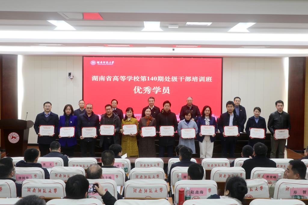 (記者 馬鐵泉 馮振輝)3月24日下午,由省委教育工委黨校與我校聯(lián)合舉辦的湖南省高等學(xué)校第140期處級干部培訓(xùn)班結(jié)業(yè)典禮在中和講堂舉行。省委教育工委副書記、省教育廳黨組成員、一級巡視員王建華,省委教育工委黨校常務(wù)副校長、省高校干部培訓(xùn)中心書記、主任劉國華,我校黨委副書記周俊武出席典禮。典禮由我校黨委委員、黨委組織部部長沈又紅主持。