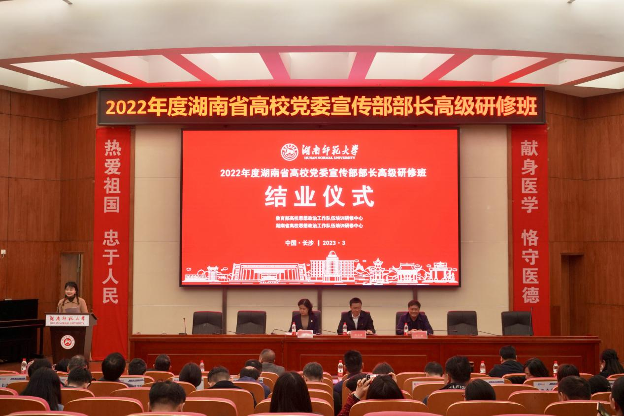 我校黨委委員、宣傳部部長段巍宣讀了《關于準予王建湘等113名湖南省高校黨委宣傳部部長高級研修班學員結業的決定》和《關于授予張佳等13名學員“2022年度湖南省高校黨委宣傳部部長高級研修班優秀學員”榮譽稱號的決定》。