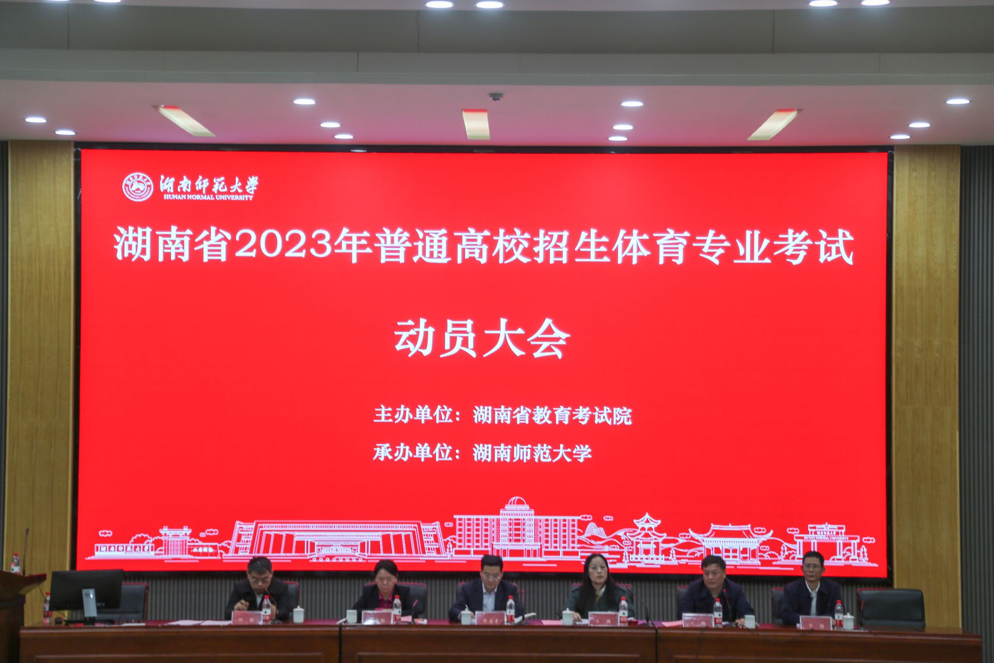 (記者 李影 項和烽)4月10日上午,湖南省2023年普通高校招生體育類專業統一考試動員大會在我校召開。省教育考試院院長、黨委副書記、紀委書記曹文才,我校紀委書記姚春梅、副校長王輝出席會議。會議由我校招生與就業指導處處長田野主持。