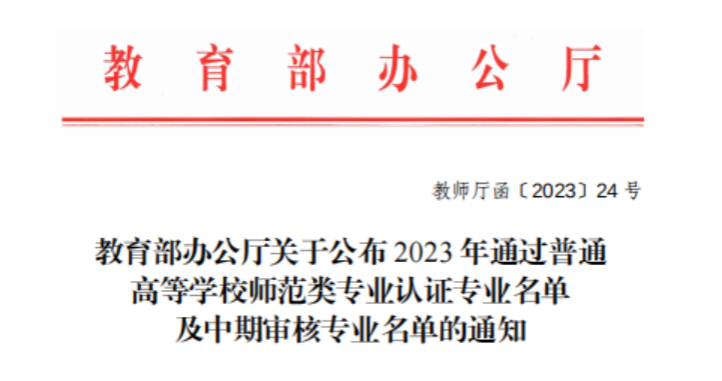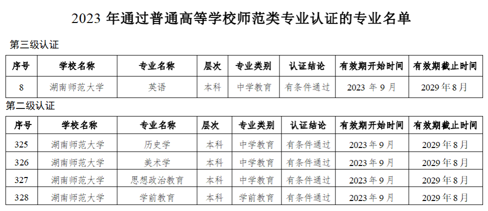 (供稿 教務(wù)處)近日,教育部公布了2023年通過普通高等學(xué)校師范類專業(yè)認(rèn)證名單及通過中期審核專業(yè)名單,我校英語專業(yè)通過師范類第三級(jí)認(rèn)證,成為全國首個(gè)通過第三級(jí)認(rèn)證的英語專業(yè),也是湖南省首個(gè)通過第三級(jí)認(rèn)證的師范專業(yè);歷史學(xué)、美術(shù)學(xué)、思想政治教育、學(xué)前教育等4個(gè)專業(yè)通過師范類第二級(jí)認(rèn)證,結(jié)論有效期6年;地理科學(xué)、音樂學(xué)、物理學(xué)等3個(gè)專業(yè)通過師范類專業(yè)認(rèn)證中期審核。