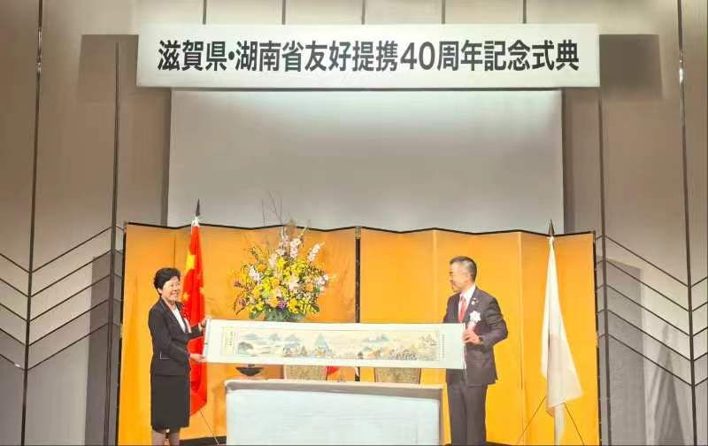 (供稿 語言與文化研究院)11月10日至11日,省委常委、市委書記吳桂英代表湖南省委、省政府率團訪問滋賀縣,與滋賀縣知事三日月大造會談,并共同出席湘滋結好40周年慶典等活動。其間,我校研發、繡制的“瀟湘八景”國家級非遺湘繡長卷等作品被遴選為湖南省人民政府定制禮品贈予滋賀縣政府。