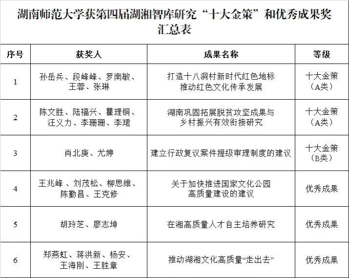 經單位推薦、資格審查、專家評審、網上公示等環節,共22項成果獲評第四屆湖湘智庫研究“十大金策”,35項成果獲評第四屆湖湘智庫研究優秀成果。我校2項成果獲評第四屆湖湘智庫研究“十大金策”(A類);1項成果獲評第四屆湖湘智庫研究“十大金策”(B類);3項成果獲評第四屆湖湘智庫研究優秀成果,獲獎總數位居全省首位。