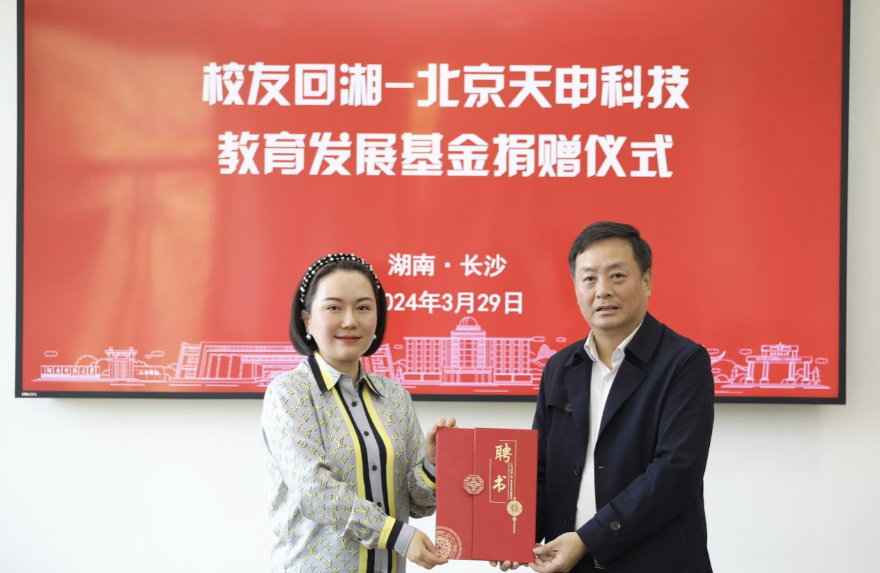 “北京天申科技教育發展基金”由北京天申科技有限公司出資捐贈,總額200萬元,主要用于資助學業成績優異的困境學生、獎勵優秀學生干部和支持學校“校友回湘”專項工作等。