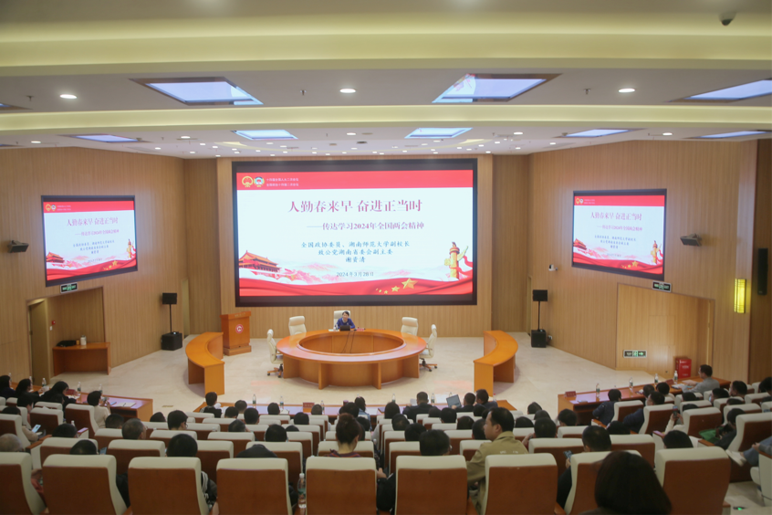 謝資清傳達了十四屆全國人大二次會議精神與全國政協十四屆二次會議精神,她從2023年工作回顧、2024年經濟社會發展總體要求和政策取向以及2024年政府工作任務等三部分對2024年政府工作報告進行了詳細解讀,重點闡釋了有關教育、科技和創新的內容以及兩會新詞熱詞,介紹了駐湘全國政協委員履職情況和個人履職情況。謝資清表示,自己作為政協委員,必當為國履職、為民盡責。