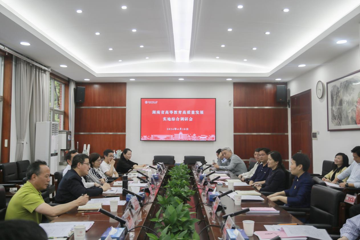 (供稿 發展規劃與學科建設處)4月18日下午,省委改革辦改革三處處長羅琛、省教育廳高教處處長劉奇軍等一行來校開展湖南省高等教育高質量發展實地綜合調研座談,座談會在校辦公樓二會議室舉行。副校長謝資清出席調研活動。座談會由發展規劃與學科建設處處長孫岳兵主持。