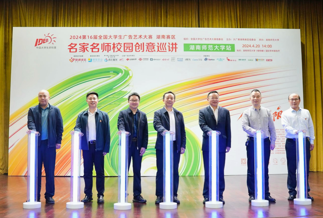 (供稿 新聞與傳播學院)4月20日下午,第16屆全國大學生廣告藝術大賽(以下簡稱“大廣賽”)湖南賽區啟動儀式暨名家名師校園創意巡講活動在我校國際學術報告廳舉辦。湖南省教育廳高等教育處處長劉奇軍、懷化學院副校長姚勁松、我校副校長劉懷德等出席啟動儀式。