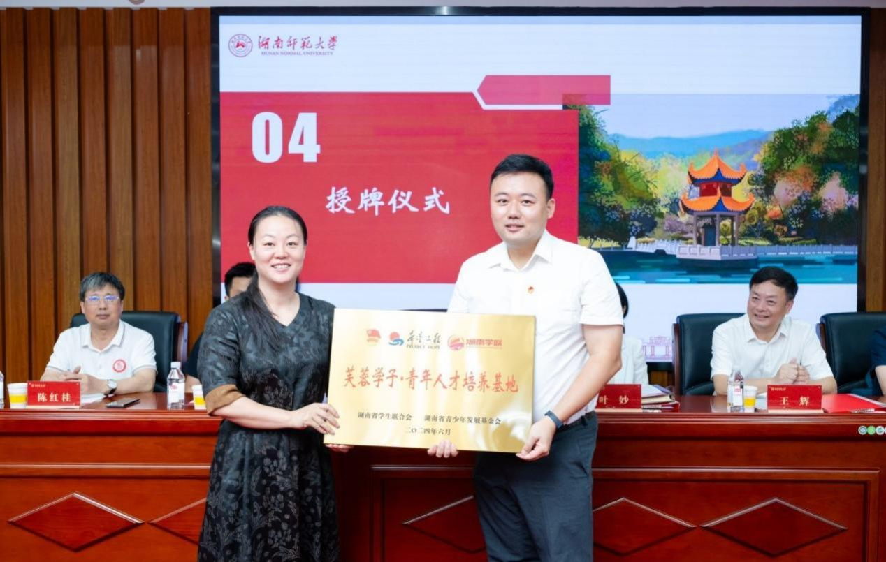 湖南省希望工程辦公室主任、湖南省青少年發(fā)展基金會理事長謝小玲為我校授予“芙蓉學子·青年人才培養(yǎng)基地”牌,我校團委書記陳天嵩接牌。