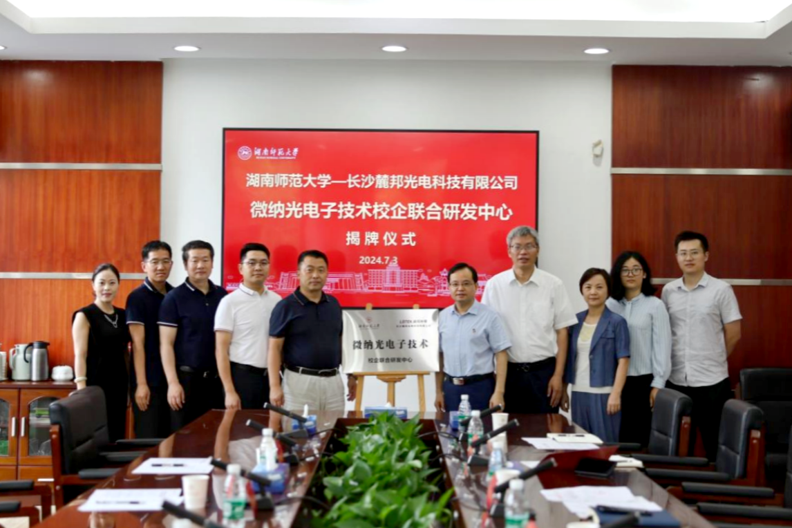 (記者 譚佳 張婧茹)7月3日上午,我校與長沙麓邦光電科技有限公司共建的微納光電子技術校企聯合研發中心揭牌儀式在校辦二會議室舉行。長沙麓邦光電科技有限公司總經理李曉春、我校副校長潘安練出席并講話,會議由科技處處長唐東升主持。
