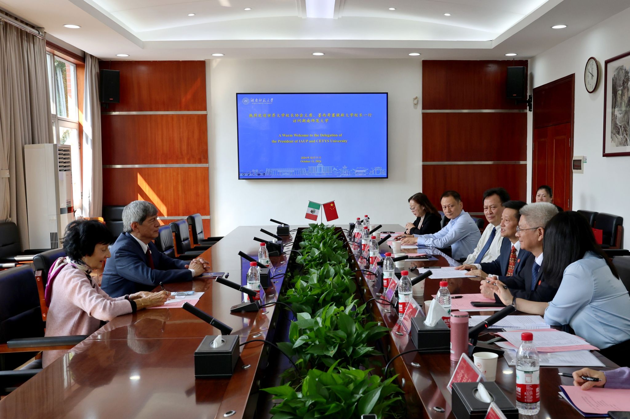 蔣洪新代表學校對費爾南多·萊昂·加西亞一行的到來表示熱烈歡迎,并介紹了我校的辦學歷史、學科建設、師資力量以及國際交流與合作的情況。他表示,自2021年加入世界大學校長協會以來,協會為我校提供了廣泛深入參與國際教育交流合作的更多平臺、更多渠道。未來,我校將繼續充分發揮特色與優勢,牽頭組織、積極參與協會的重大國際交流活動,為促進世界高等教育發展、構建人類命運共同體作出更大貢獻。他表示,高等教育的發展離不開校園和教師隊伍建設,更離不開國際國內高校交流合作。我校將珍惜此次機會,不斷提高國際化辦學水平,與墨西哥賽提斯大學攜手并進、共謀發展,為兩校加深友誼、加強合作而不懈努力。